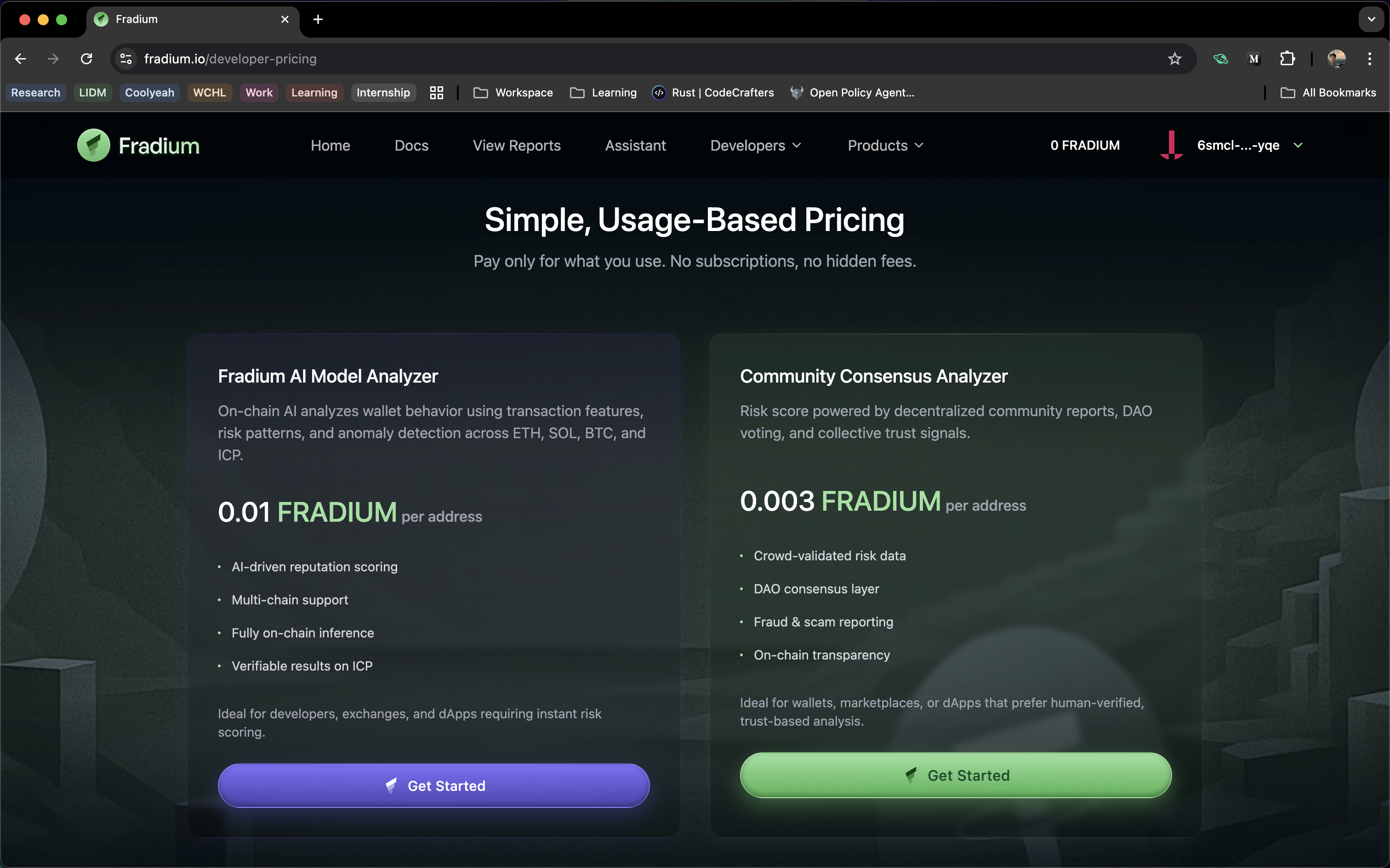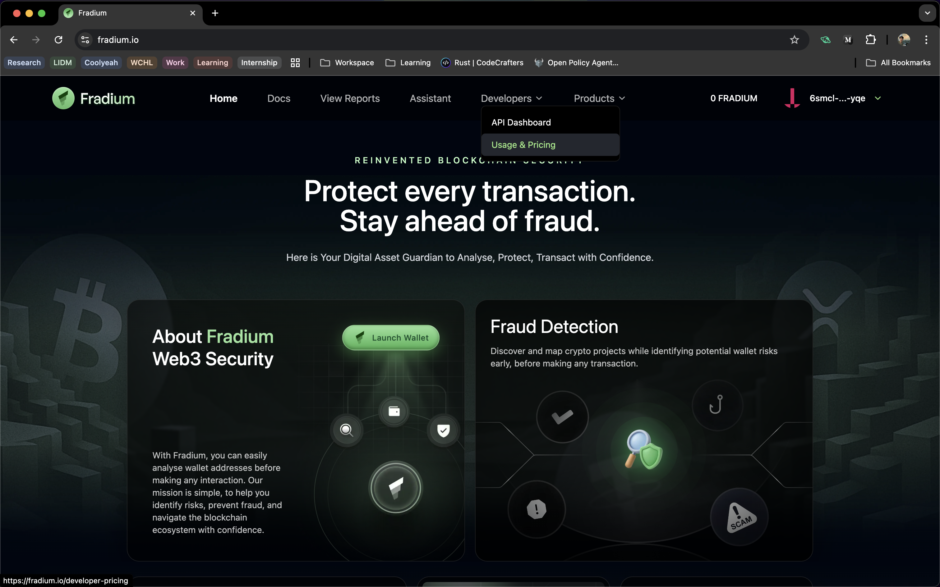 If you already on Fradium Web Application,  look at the navigation bar at the top and find the **“Developers”** dropdown button. Click it, then select **“Usage & Pricing”** from the menu.