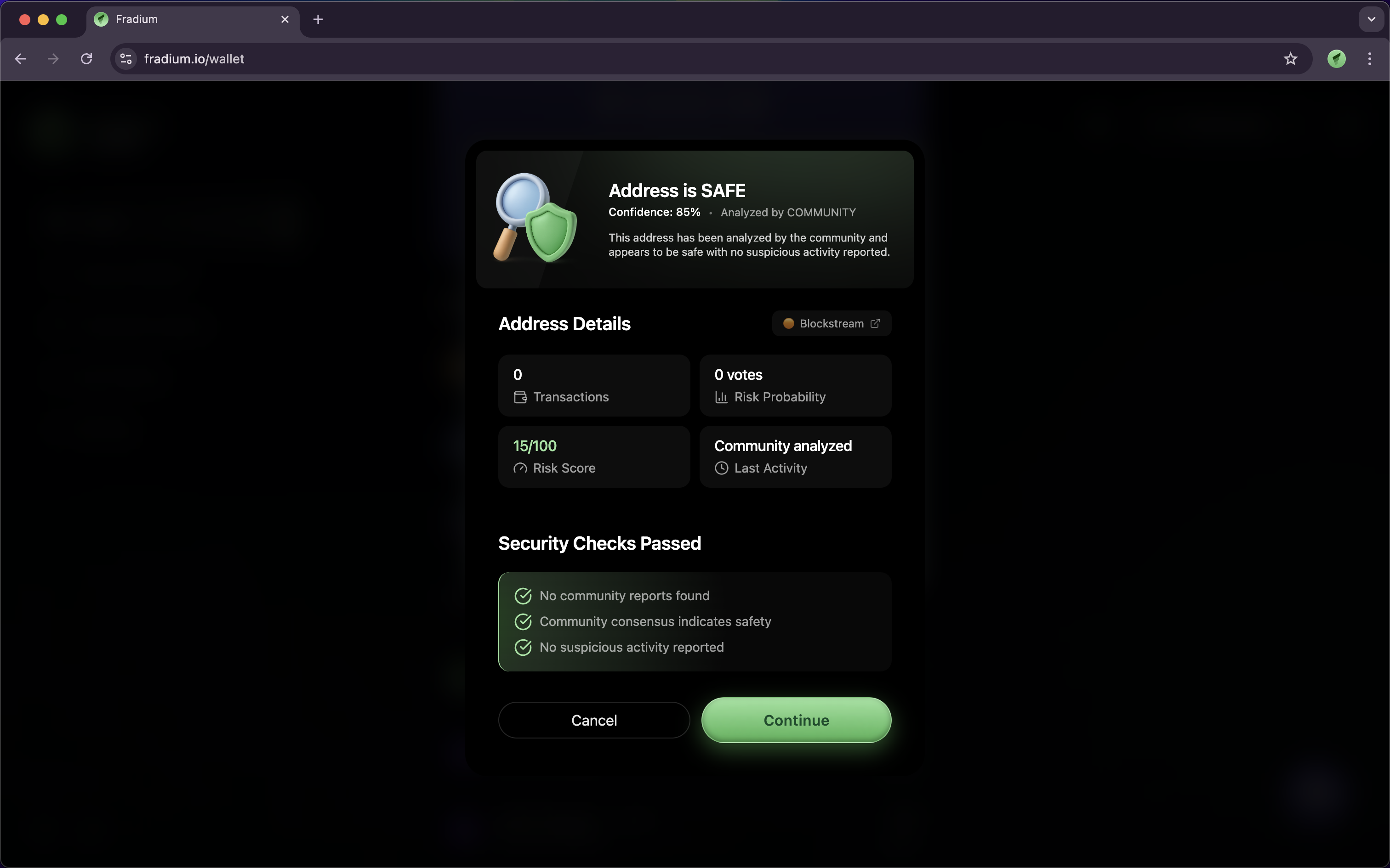 Then, it will display a summary of the destination address to determine whether the address is **SAFE** or **UNSAFE**. First, it checks the community reports before the AI Address Analysis is performed. After that, you will be given the option to either **cancel** or **continue** sending the amount to the destination wallet address.